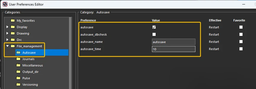 需重点注意:Autosave功能的生效方式为“Restart”(重启生效)。完成所有参数配置后,需关闭Allegro软件并重新启动,自动保存功能方可正式生效。