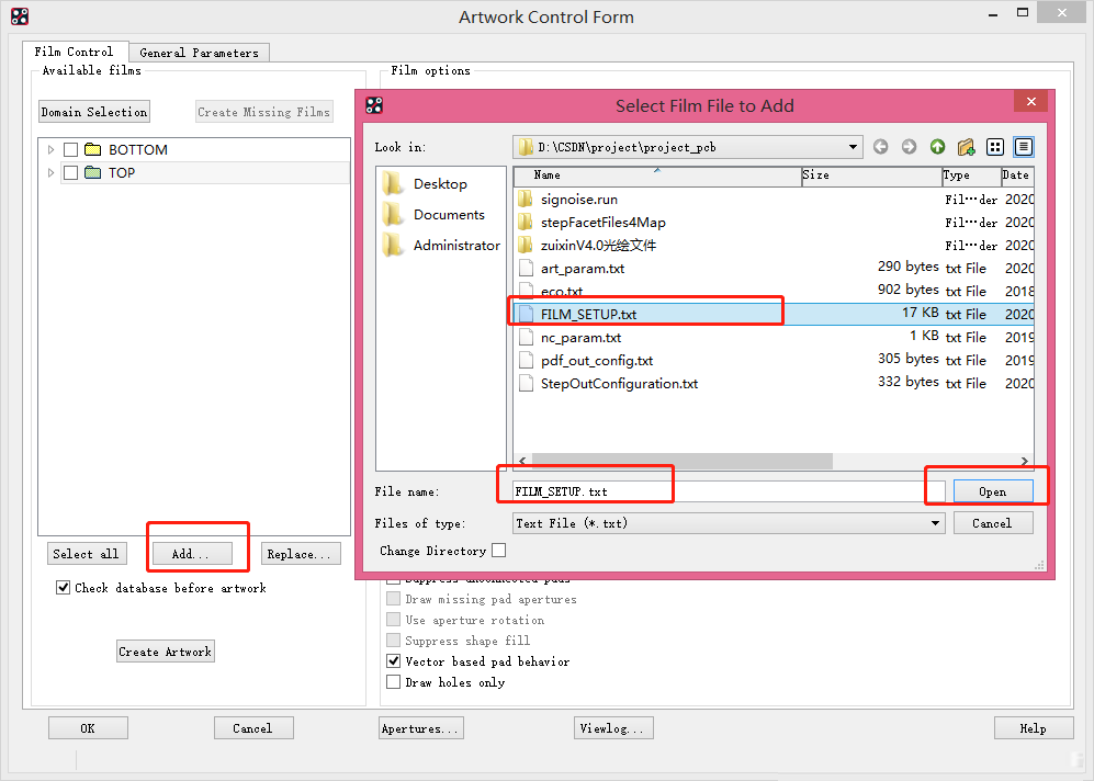 点击界面中的 “Add” 按钮,在弹出的文件浏览器中,找到之前保存的 FILM_SETUP.txt 模板文件(建议提前将模板文件拷贝至新PCB的工程文件夹,方便快速查找)。
